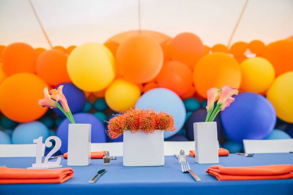 One of the most accessible and affordable ways to achieve a stunning tent ceiling look is by incorporating balloons. Rather than simply scattering them around the venue, try creating ceiling clusters.