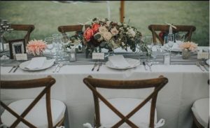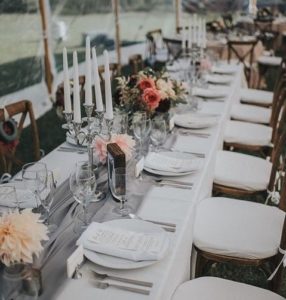 Our clear sided sailcloth tent leaves nothing to the imagination, boasting an elegant white wedding style reception. The walnut cross back chairs and silver matte satin runners add to the classic charm of the table, while our etage flatware frame the wedding white dinner plates neatly.